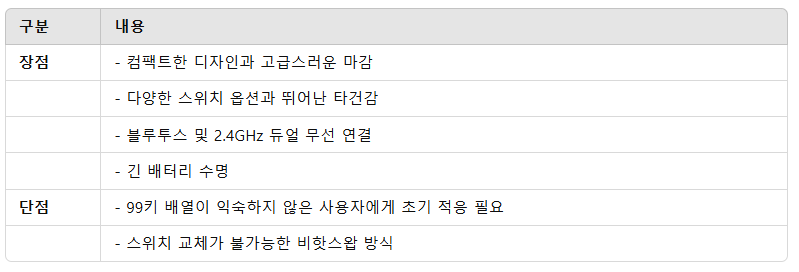 - 키 배열: 99키의 컴팩트한 레이아웃으로 공간 활용 극대화