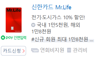 - 신한카드 Mr. Life : 도시, 전기 요금 10%할인
