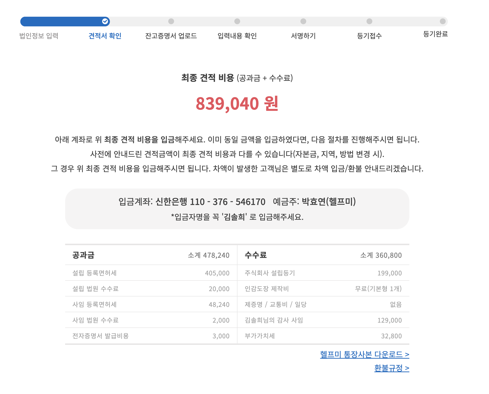 - 서류 제출: 법인 설립 시작하기 버튼을 클릭한 후, 필요한 정보를 입력하고 서류를 제출합니다. 이후, 헬프미에서 입금 금액을 안내합니다.